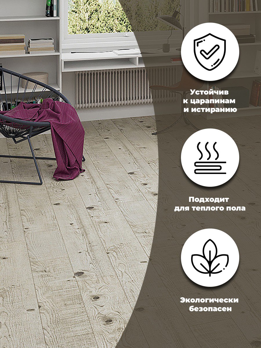 Напольное покрытие изготовленное из высокоплотной древесноволокнистой плиты HDF, с нанесением декоративного слоя, точно отображающим структуру натурального дерева и покрытое защитной пленкой. Изделие предназначено для жилых и офисных помещений, совместим с теплым полом. Прост в укладке и эксплуатации.