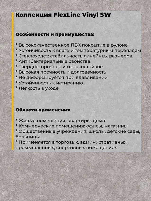Линолеум Comitex Flex Line — это высококачественное ПВХ покрытие, идеально подходящее для различных типов помещений. Продукция компании Комитекс Лин отличается долговечностью, эстетической привлекательностью и удобством в эксплуатации. Покрытие Flex Line от Comitex предлагает множество преимуществ, которые делают его популярным выбором для потребителей:Высокая прочность и долговечность: Благодаря применению современных технологий и высококачественных материалов, это покрытие способно выдерживать значительные нагрузки и надолго сохранять свой первоначальный вид.Антибактериальные свойства: Специальный защитный слой обеспечивает защиту от микробов и бактерий, что делает его идеальным для использования в местах с высокими требованиями к гигиене.Устойчивость к влаге и температурным перепадам: Покрытие сохраняет свои свойства и внешний вид даже при высоких уровнях влажности и значительных температурных колебаниях.Легкость в уходе: Материал не требует специального ухода, легко чистится и устойчив к загрязнениям. Comitex Flex Line отличается уникальной комбинацией прочности, устойчивости к истиранию и эстетической привлекательности. Благодаря этим свойствам оно широко используется как в жилых, так и в коммерческих помещениях.