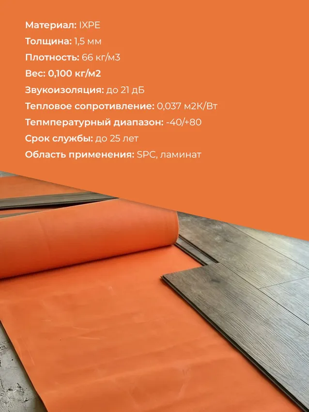 Подложка IXPE Orange 1,5 мм влагостойкая под SPC ламинат, кварцвинил 6 м2